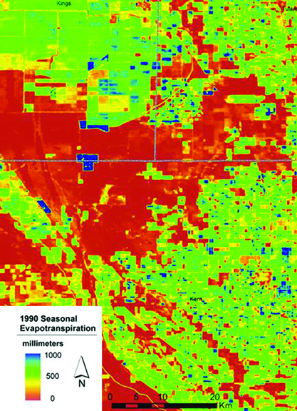 A satellite derived map showing evapotranspiration in the San Joaquin Valley for the 1990 season (Source: USGS)